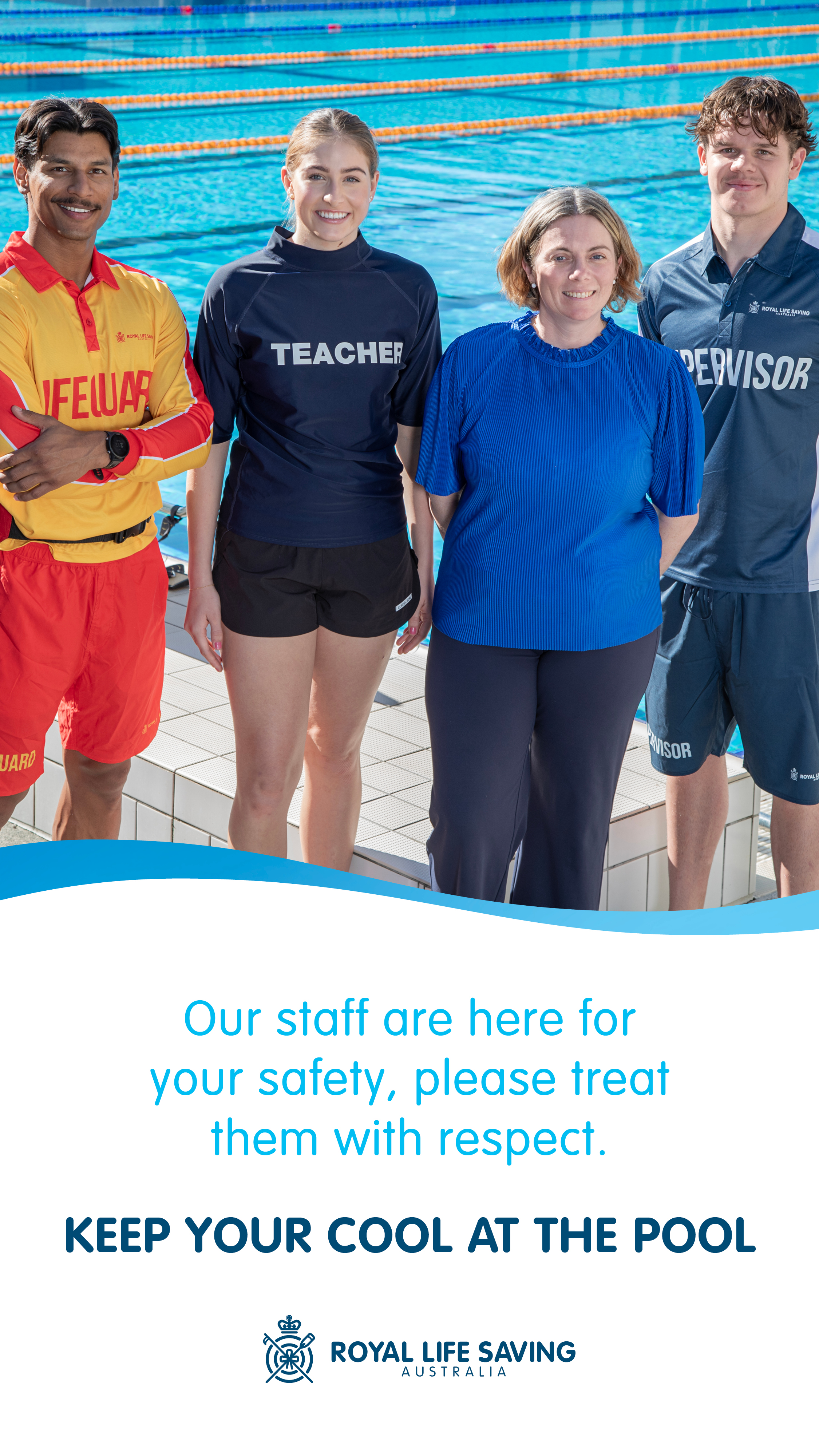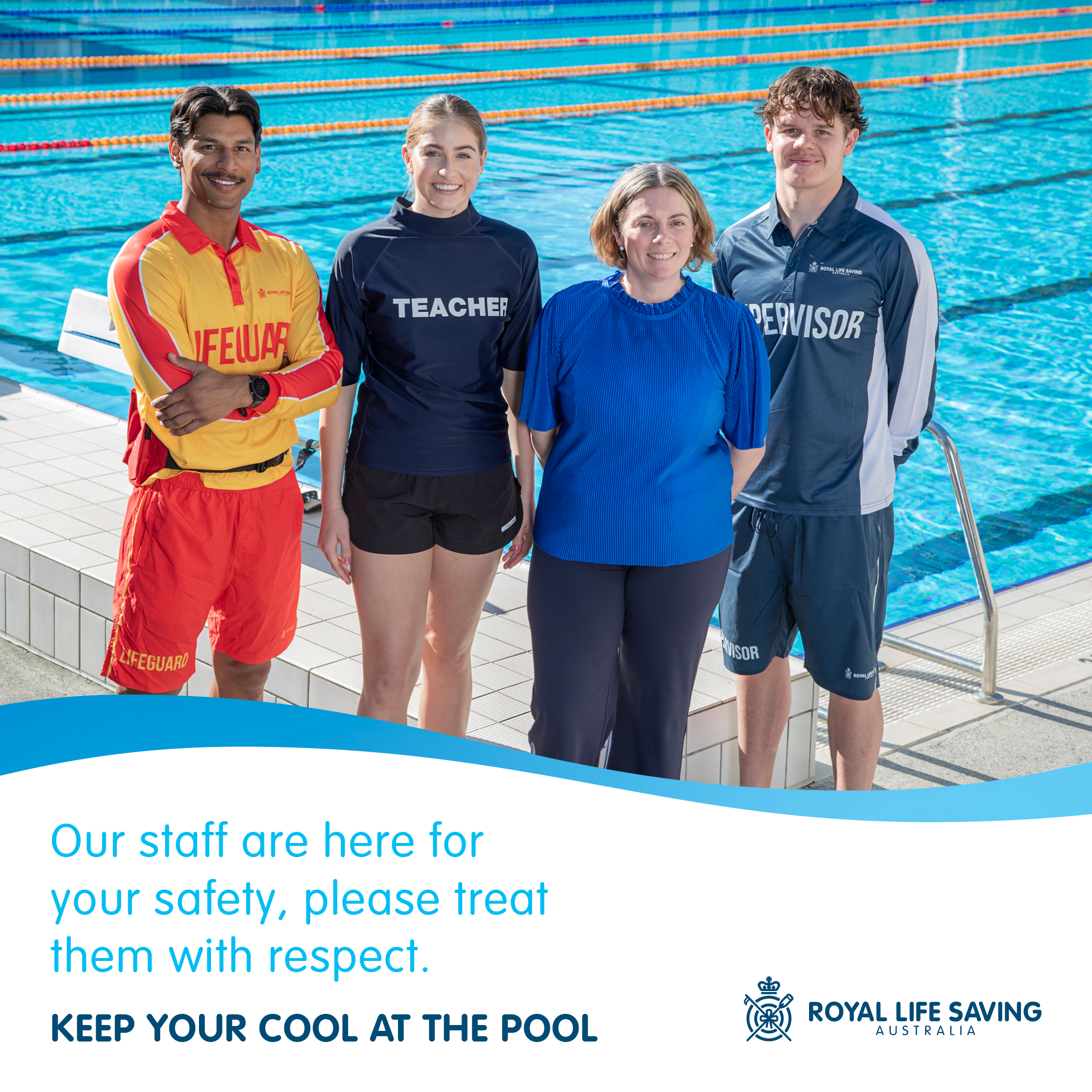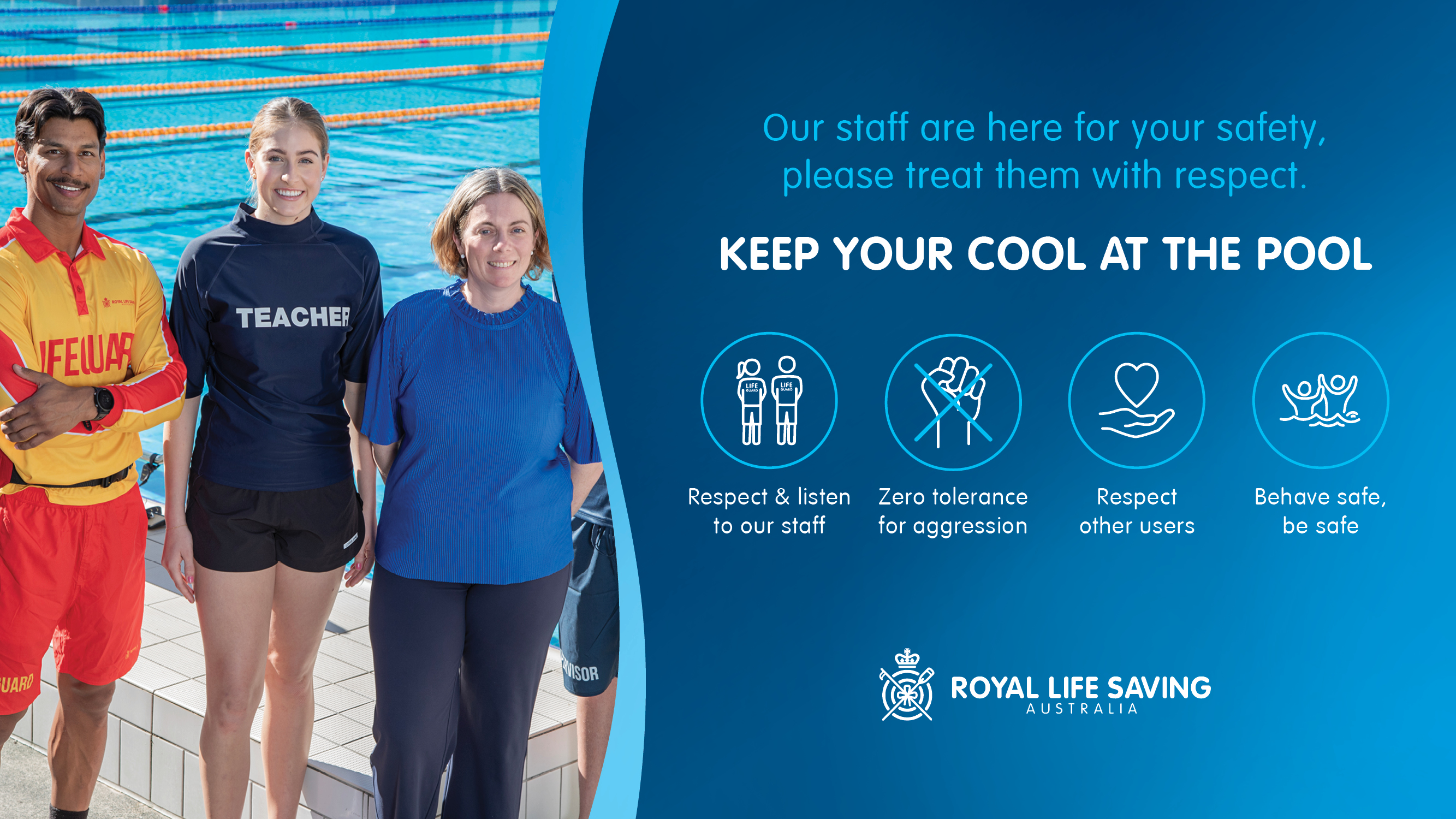 To support the safety and wellbeing of staff working in aquatic facilities, Royal Life Saving has launched the ‘Keep Your Cool at the Pool’ campaign, which sets clear behavioural expectations for patrons and calls for users of aquatic facilities to treat each other and staff respectfully.