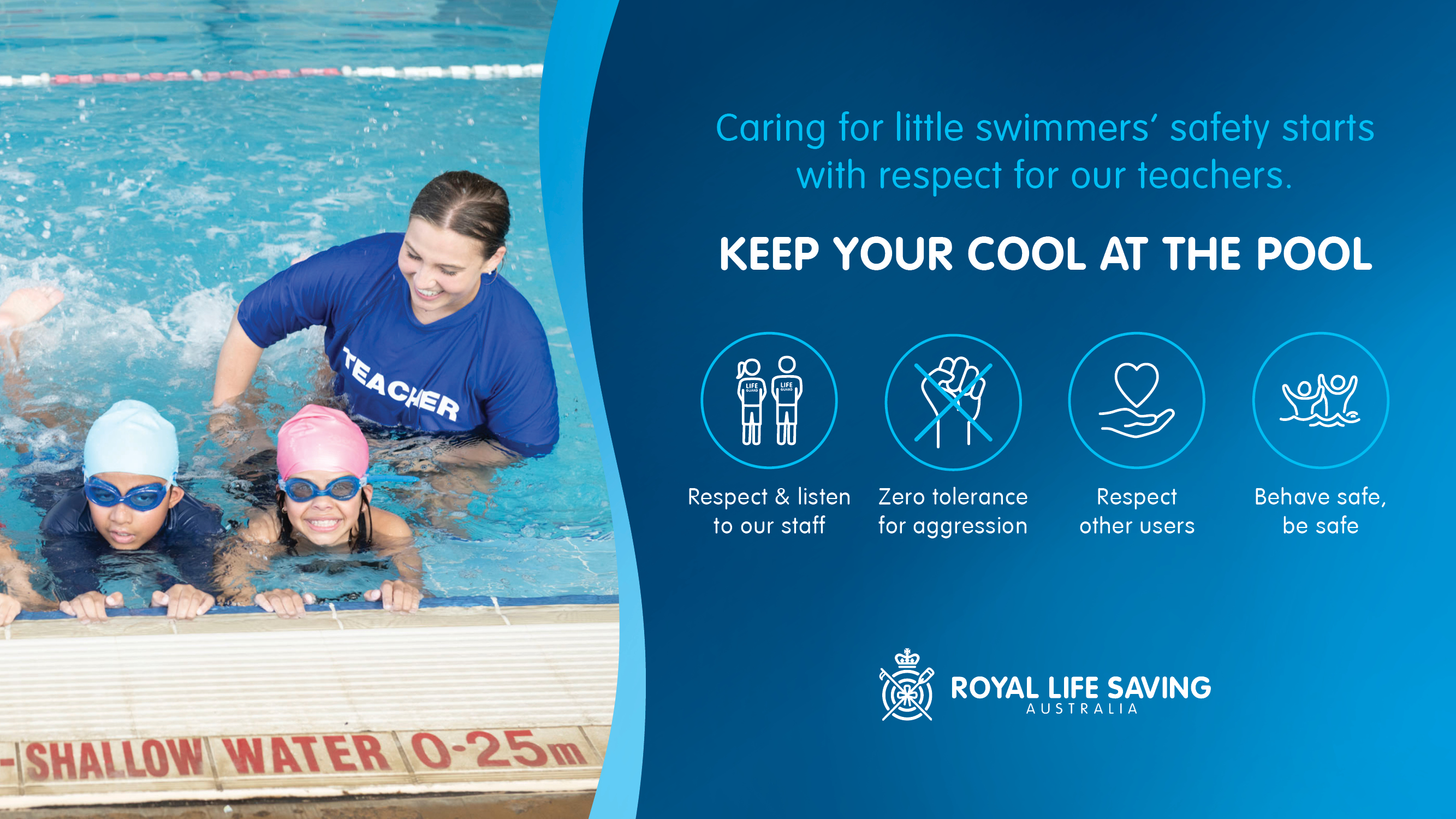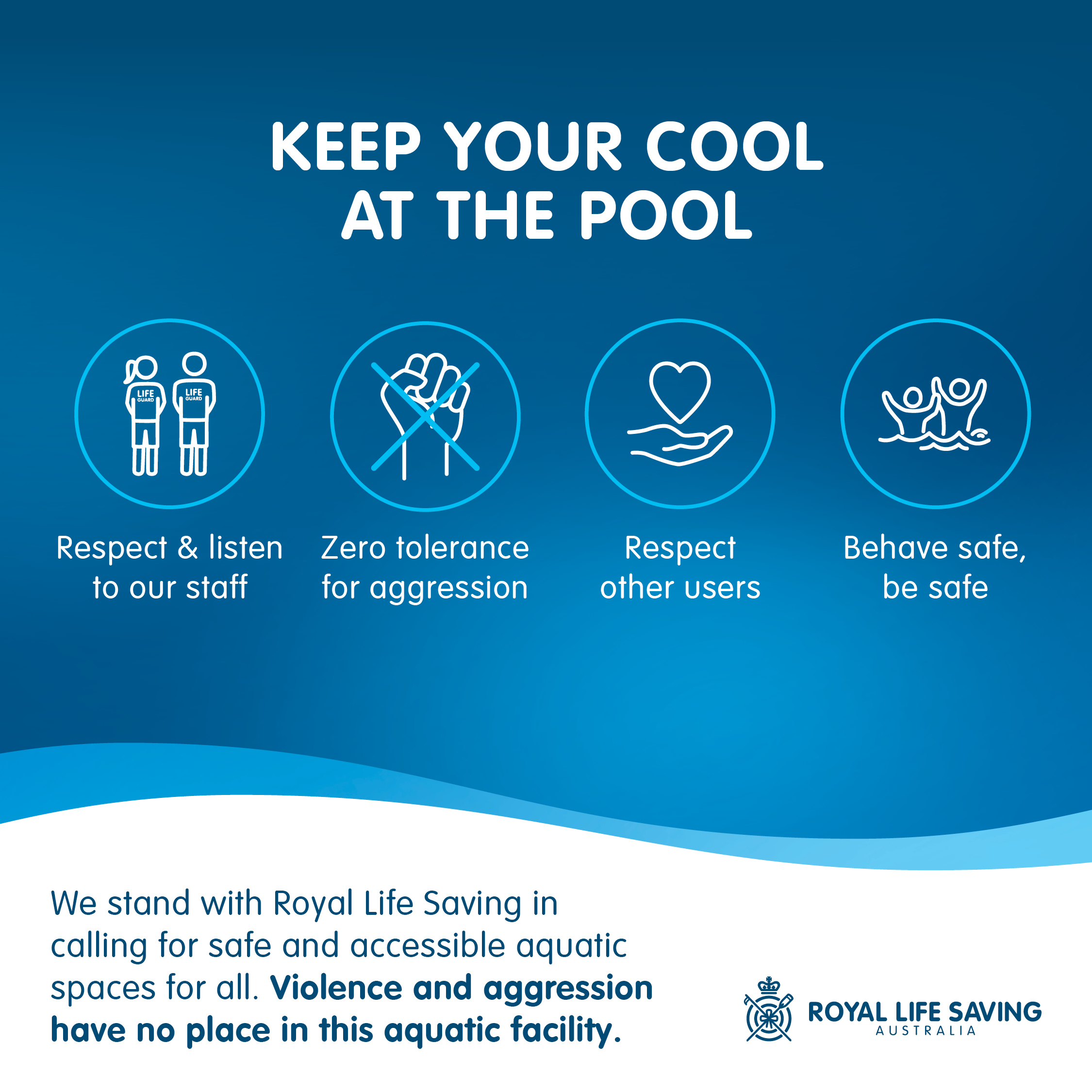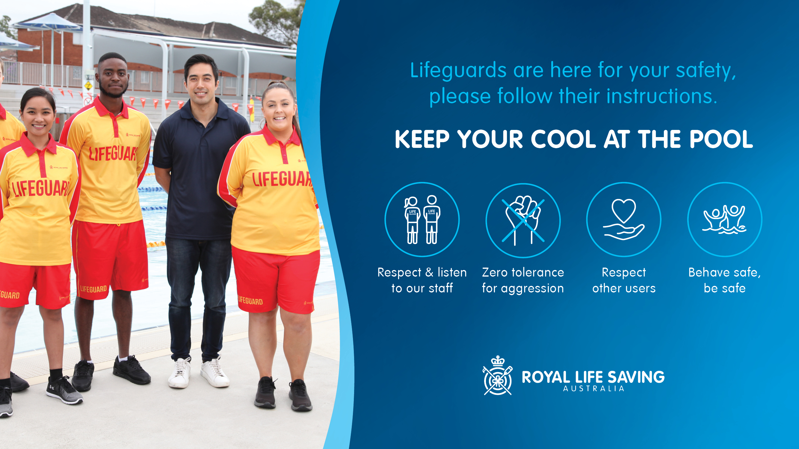 To support the safety and wellbeing of staff working in aquatic facilities, Royal Life Saving has launched the ‘Keep Your Cool at the Pool’ campaign, which sets clear behavioural expectations for patrons and calls for users of aquatic facilities to treat each other and staff respectfully.